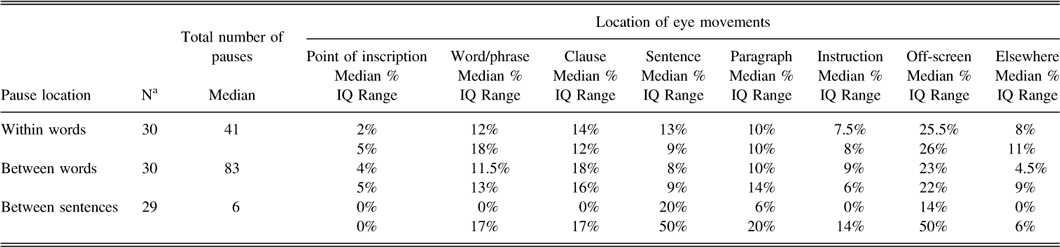 Table 3 provides the median percentage of eye-gaze behaviors by pause location, that is, the values in the table present the median for how many times participants’ eye gazes stayed within a particular area of interest (e.g., point of inscription, previous word/phrase) during a pause out of all the pauses they made at that location type (e.g., within words).