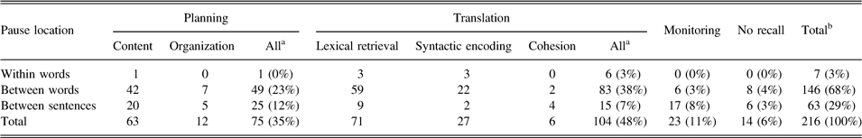 Turning to subprocesses, in total, most of the planning comments mentioned planning content (84%), and the majority of translation comments concerned lexical encoding mechanisms (68%). The distributions were similar across pause locations for translation subprocesses. The only exception to this trend was that, for the small number of within-word pauses (n = 6), there was a lack of difference between the number of lexical and syntactic encoding-related comments.