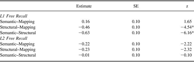 TABLE 3. Results of logit mixed-effects model for L1 and L2 free recall