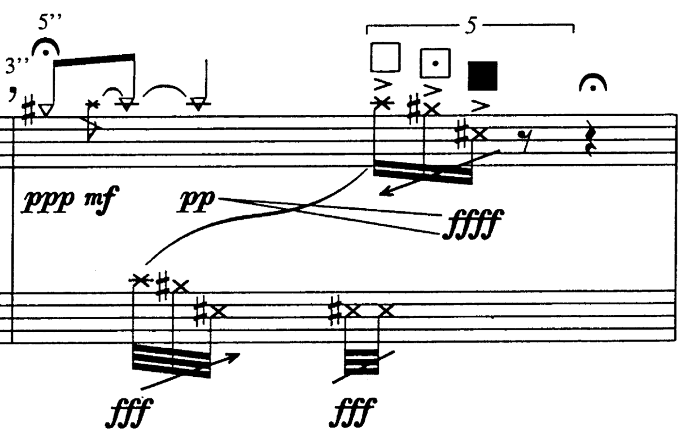 Example 12: Luigi Nono, A Pierre – Dell'Azzurro silenzio, inquietum, bars 8 and 9, © 1985 Ricordi Music. The small back noteheads (B′′ and A′′) as well as the F#′′ under the indication ‘con fischio’ are to be whistled.