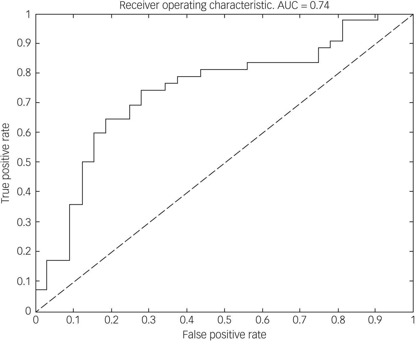 Fig. 1 Receiver operating characteristic curve for discriminating between people with dissociative identify disorder (DID) and healthy controls. The dotted line indicates chance level and the solid line is constructed by varying the decision threshold smoothly between 0 and 1, plotting true-positive rate (sensitivity) against false-positive rate (1 − specificity). Points northwest of the dotted line indicate above chance discrimination. The area under the curve (AUC) summarises classifier performance across all decision thresholds.