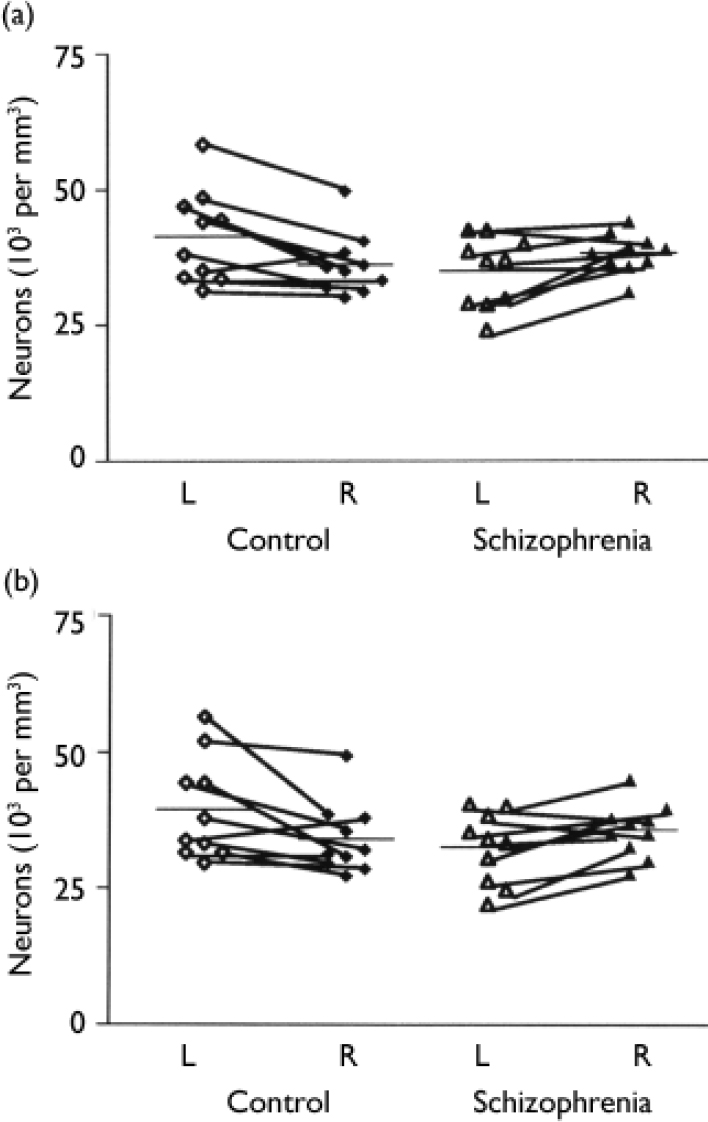In a series of ten brains from individuals with schizophrenia and ten comparison brains from individuals of similar age, we did not detect evidence of an overall increase in neuronal density in the prefrontal cortex in the disease group; instead, we found a decrease in neuronal density in the left hemisphere and an increase in density in the right hemisphere in comparison with controls, and that in these controls the density on the left was greater than that on the right. This finding can be interpreted as indicating either a left-sided reduction in neuronal density or a loss (or perhaps even a reversal) of cerebral asymmetry.