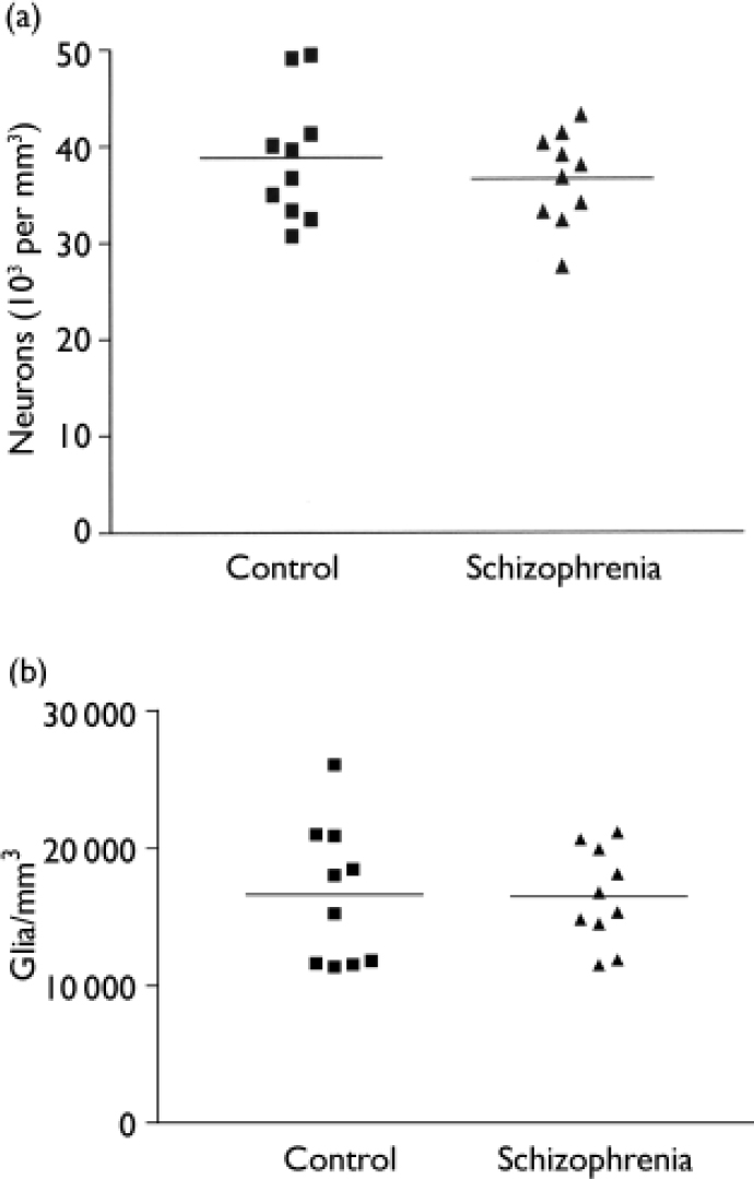 Our results contrast with those of Selemon et al, who found that in people with schizophrenia neuronal density was increased by 17% in left BA 9 (Selemon et al, Reference Selemon, Rajkowska and Goldman-Rakic1995, Reference Selemon, Rajkowska and Goldman-Rakic1998). We believe that methodological factors are unlikely to explain the differences between the findings, since both groups used similar methods: celloidin embedding and a nearly identical counting protocol. Furthermore, subtle differences in the delineation of anatomical areas are an improbable explanation, since Selemon et al found raised neuronal density in the area of cortex beside BA 9 (i.e. BA 46) and also in primary visual cortex, although in a subsequent study not in BA 44 (Reference Selemon, Mrzljak and KleinmanSelemon et al, 2003). Pakkenberg (Reference Pakkenberg1993) also found an increase in neuronal density in the frontal lobe considered as a single entity. It is possible that the differences between the findings in different studies relate to shrinkage; although shrinkage due to embedding varied markedly from case to case in our study, the mean shrinkage for each group was nearly identical.
