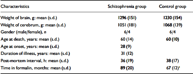 Brains taken post-mortem from 10 people with schizophrenia and 10 comparison brains from individuals without mental illness were collected at three centres in the UK, as described by Highley et al (Reference Highley, Esiri and Cortina-Borja1998, Reference Highley, McDonald and Walker1999). The brains used in this study were selected from a larger series to include only individuals younger than 75 years at death, whose post-mortem interval was less than 72 h. Demographic details are summarised in Table 1. Diagnoses were made by T. J. Crow on review of the clinical notes to verify that there was clear evidence that the cases satisfied DSM-IV criteria for schizophrenia (American Psychiatric Association, 1994), and that the comparison group had no history of psychiatric or neurological disorder. All of the people with schizophrenia had been receiving long-term antipsychotic medication, seven had been given electroconvulsive therapy and three had received insulin coma treatment. Brains were fixed in 10% formalin by suspension from the basilar artery, and cut into 5 mm thick coronal slices. All brains were examined by a neuropathologist (M.M.E. or Dr B. McDonald, Department of Neurology, University of Oxford) to exclude macroscopic or microscopic neuropathology such as Alzheimer's disease (using the criteria of the Consortium to Establish a Registry for Alzheimer's Disease; Reference Mirra, Heyman and McKeelMirra et al, 1991), Parkinson's disease or stroke.