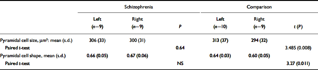 Table 4 gives the mean cross-sectional area of pyramidal neurons in cortical layer 3. Pyramidal neurons in layer 3 were larger on the left than the right in control brains (P < 0.008) but were equal in size on the two sides in the schizophrenia brains. Pyramidal cell size did not correlate with any of the demographic variables, although there was a trend towards a negative correlation with age at death (r=-0.432, d.f.=16, P=0.073). The index of pyramidal cell shape revealed an asymmetry in layer 3 (left > right), reflecting neurons being shorter and/or fatter in the left hemisphere in the comparison group, but with no asymmetry in the schizophrenia group.