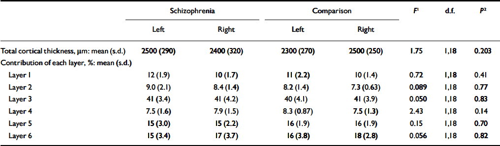 1. F ratios represent the results of repeated-measures analysis of variance comparing the difference between right and left pyramidal neuronal density between the schizophrenia and control brains. Analysis of the combined layers gives F=5.48, d.f.=1,18, P=0.031.
