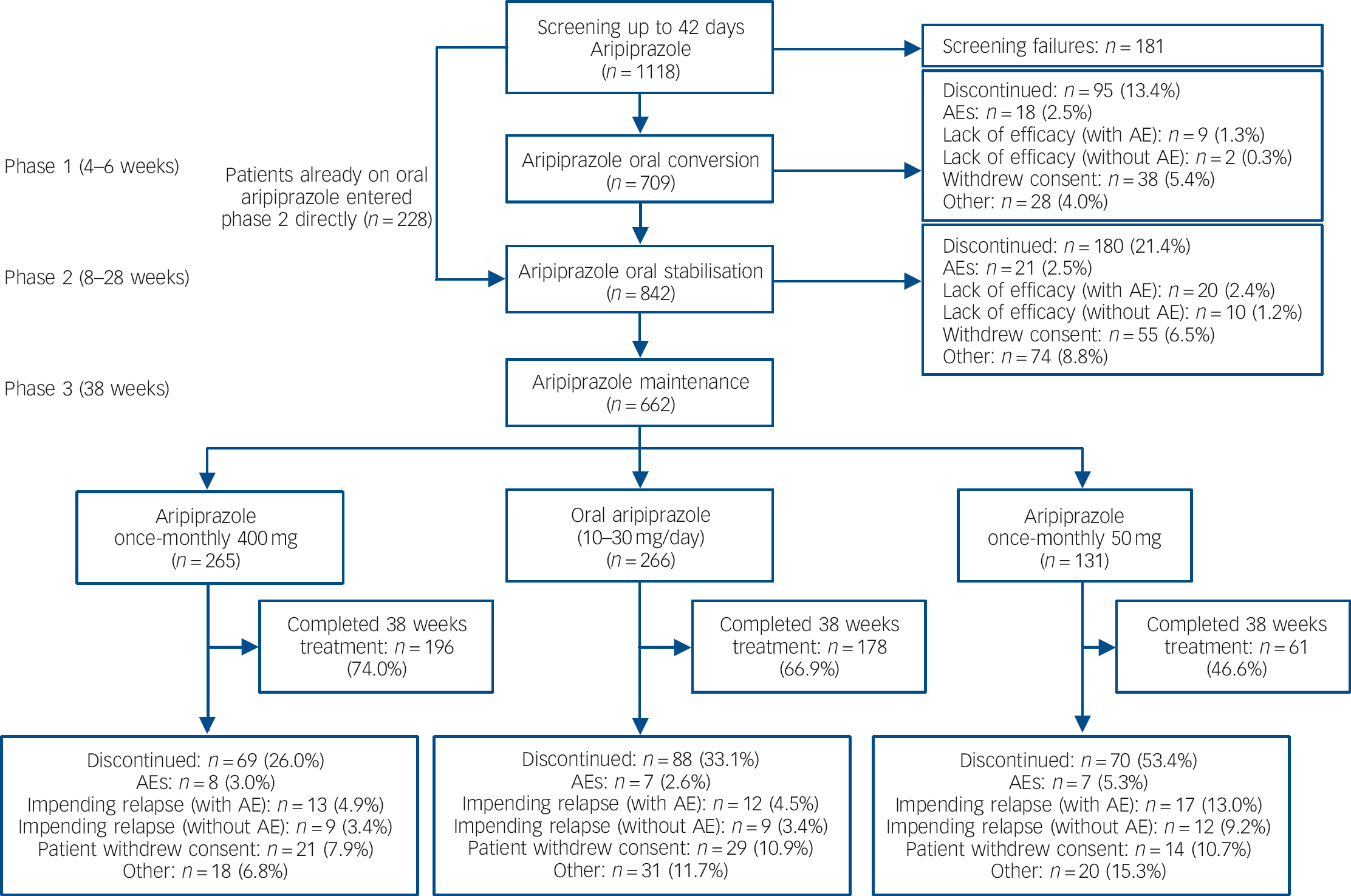 Of 1118 patients screened, 709 patients entered the oral conversion phase (phase 1) and 842 entered the oral stabilisation phase (phase 2), including 228 patients who were already receiving oral aripiprazole and entered phase 2 directly (Fig. 1). A total of 662 patients were randomised to double-blind treatment in phase 3 (Fig. 1). The number of individuals who dropped out because of adverse events was low in the aripiprazole once-monthly 400 mg group and oral aripiprazole group; the main reason for discontinuation during phase 3 was patient withdrawal of consent (Fig. 1). For patients receiving aripiprazole once-monthly 50 mg, the main reason for discontinuation was impending relapse with an adverse event.
