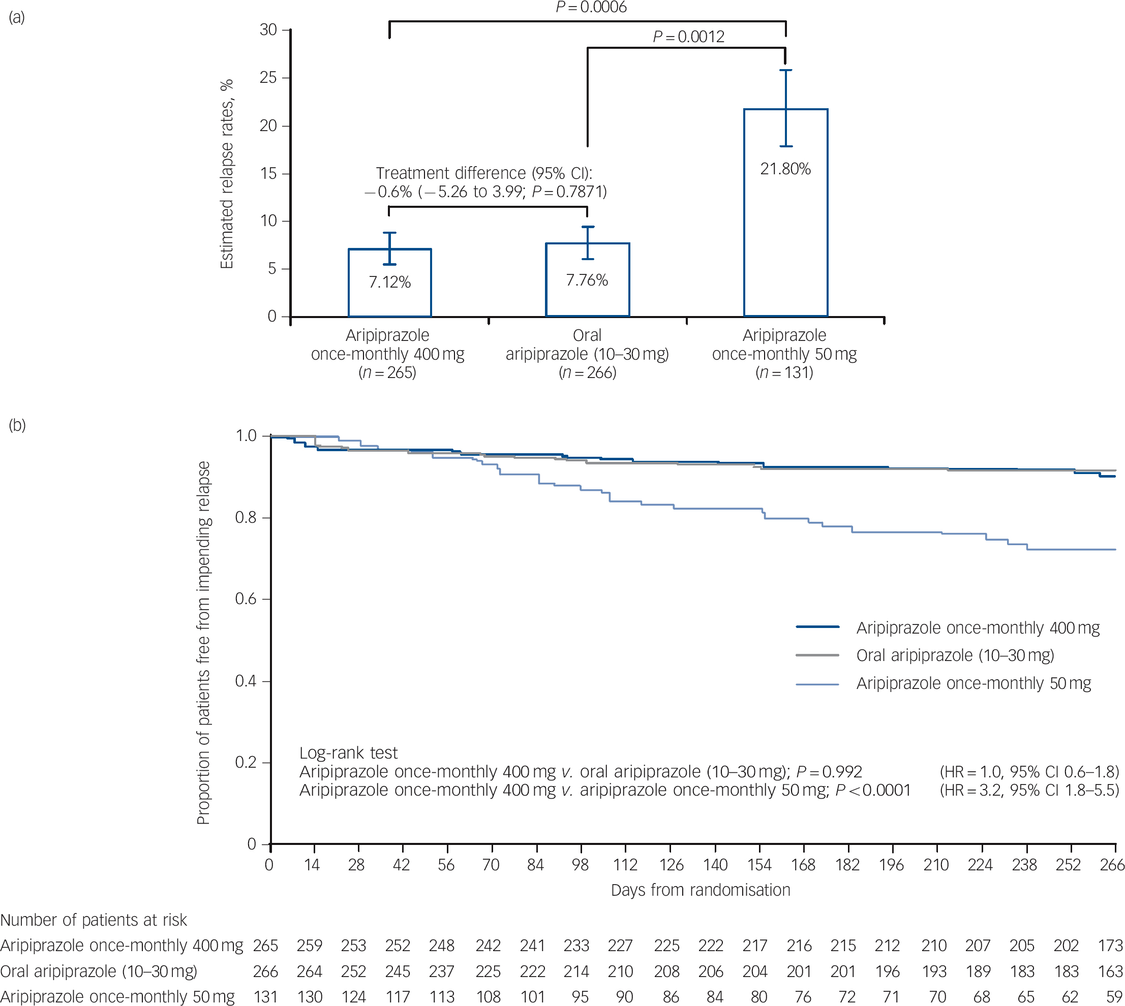 Time to observed impending relapse and observed rate of impending relapse at week 38 (ITT sample). Time to observed impending relapse (based on all available relapse data through week 38) for aripiprazole once-monthly 400 mg, oral aripiprazole and aripiprazole once-monthly 50 mg was compared using the log-rank test. The observed impending relapse rates were compared between groups using the chi-squared test. Hazard ratios (and two-sided 95% confidence interval for aripiprazole once-monthly 400 mg v. oral aripiprazole and aripiprazole once-monthly 50 mg, and for oral aripiprazole v. aripiprazole once-monthly 50 mg) for risk of observed impending relapse were analysed using a Cox proportional hazard model with treatment as the factor.