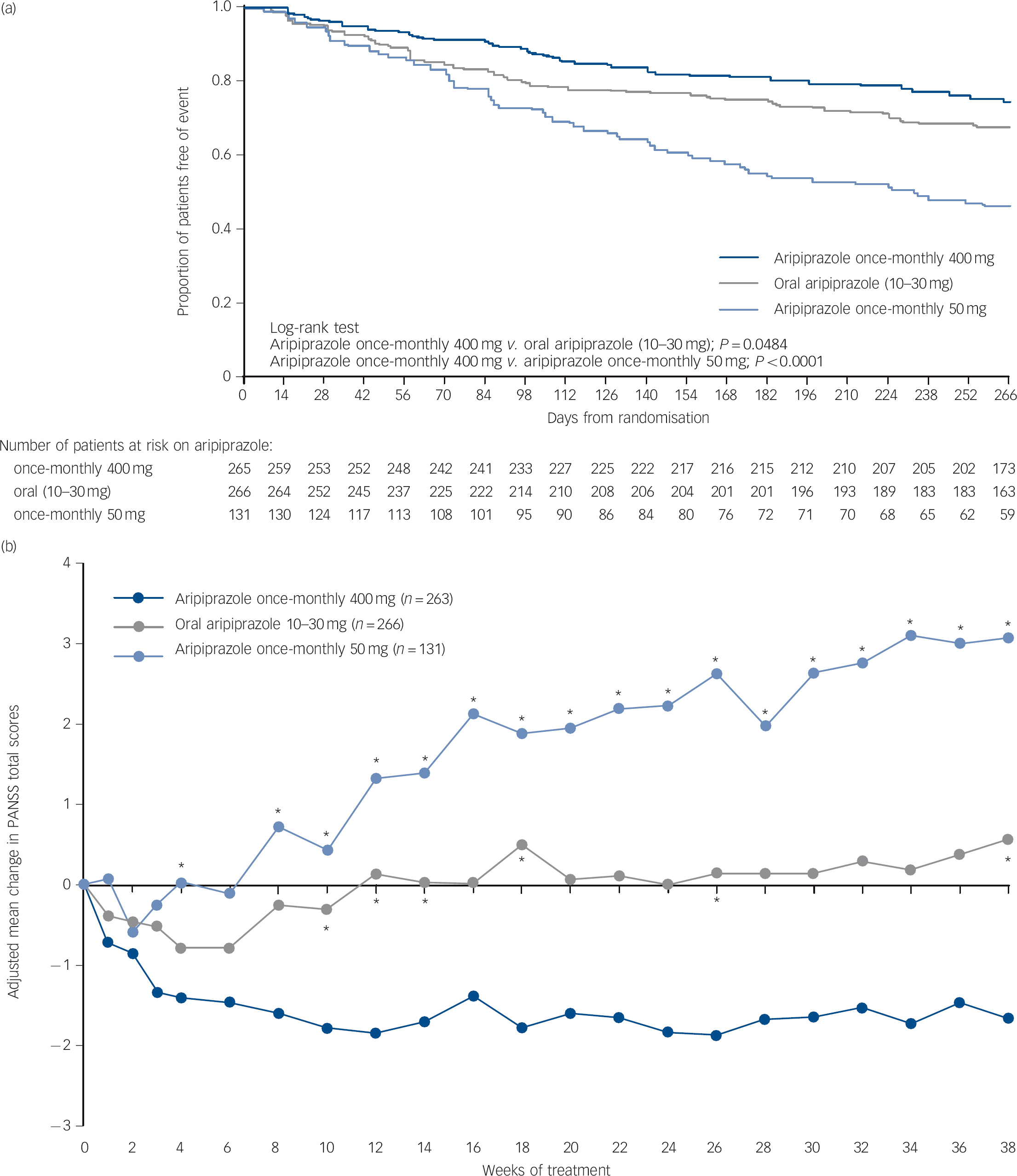 In phase 3 (double-blind maintenance phase for up to 38 weeks), eligible patients were randomised 2:2:1 to aripiprazole once-monthly 400 mg, oral aripiprazole (10-30 mg/day) or aripiprazole once-monthly 50 mg. Aripiprazole once-monthly was administered into the gluteal muscle using a double-dummy design such that all patients, including those randomised to oral aripiprazole, received an injection. For patients randomised to aripiprazole once-monthly 400 mg or 50 mg, a one-time option to decrease to 300 mg or 25 mg, respectively, was permitted, as was a one-time return to the original assigned dose. Patients treated with aripiprazole once-monthly 400 mg or 50 mg received concomitant oral aripiprazole (10-20 mg) for 2 weeks from the date of randomisation, and then placebo tablets thereafter. This dosing strategy was based on previous pharmacokinetic studies that demonstrated that 400 and 300 mg aripiprazole once-monthly exhibited pharmacokinetic and safety profiles similar to those of multiple, consecutive, daily oral doses of 10-30 mg aripiprazole monotherapy.Reference Mallikaarjun, Kane, Bricmont, McQuade, Carson and Sanchez9 For patients randomised to oral aripiprazole, a one-time change in dose (increase or decrease) and a one-time reversal of the change (decrease in dose if previously increased or increase in dose if previously decreased) was permitted as long as the dose remained within the range of 10-30 mg daily.
