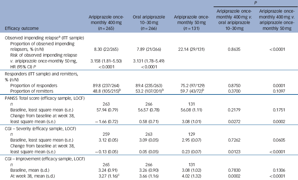 | Efficacy outcome | Aripiprazole once- monthly 400 mg (n = 265) | Oral aripiprazole 10-30 mg | Aripiprazole once- monthly 50 mg (n = 131) | Aripiprazole once- monthly 400 mg v. oral aripiprazole 10-30 mg | Aripiprazole once- monthly 400 mg v. aripiprazole once- monthly 50 mg |