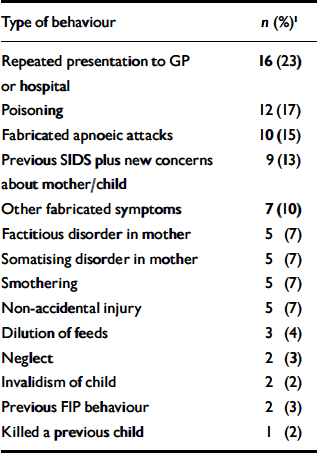 In terms of physical invasiveness, the behaviours ranged from inappropriate repeated presentation to a general practitioner (GP) to deliberate smothering or poisoning to induce medical symptoms in the child (see Table 1). In two cases, there was no new behaviour, but there was a history of previous factitious illness by proxy behaviour towards other children. In nine cases, there was a history of previous sudden infant death syndrome in addition to new factitious illness by proxy behaviour and/or concerns about the mother's parenting ability.