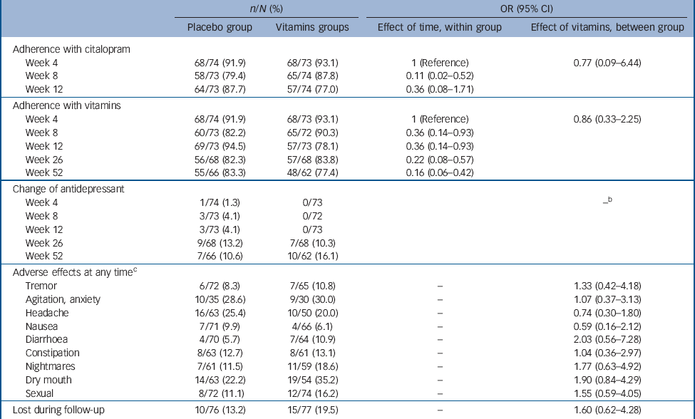 Table 3 Measures of adherence to treatment and change in the use of antidepressants over time, and adverse effects reported by participants treated with placebo and vitaminsFootnote a