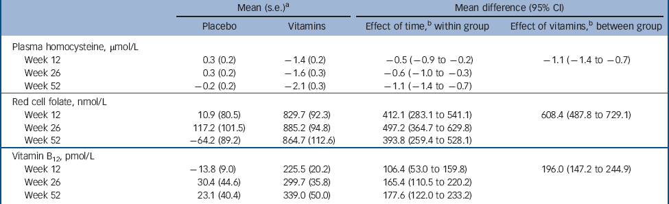 Table 3 summarises data on adherence to treatment with citalopram and vitamins/placebo, as well changes of anti-depressants and adverse experiences of participants assigned treatment with placebo and vitamins. There were no differences between the study groups in any of these measures. Moreover, there were no breaches of protocol or unmasking during the study. Finally, treatment with vitamins was associated with a significant reduction in tHcy (–1.1 μmol/L, 95% CI –1.4 to –0.7 μmol/L; adjusted for gender and baseline tHcy), and increased red cell folate (608.4 nmol/L, 95% CI 487.8 to 729.1 nmol/L; adjusted for gender and baseline red cell folate) and serum B12 (196.0 pmol/L, 95% CI 147.2 to 244.9 pmol/L; adjusted for gender and baseline serum B12), indicating that treatment had the expected effect on these measures (Table 4).