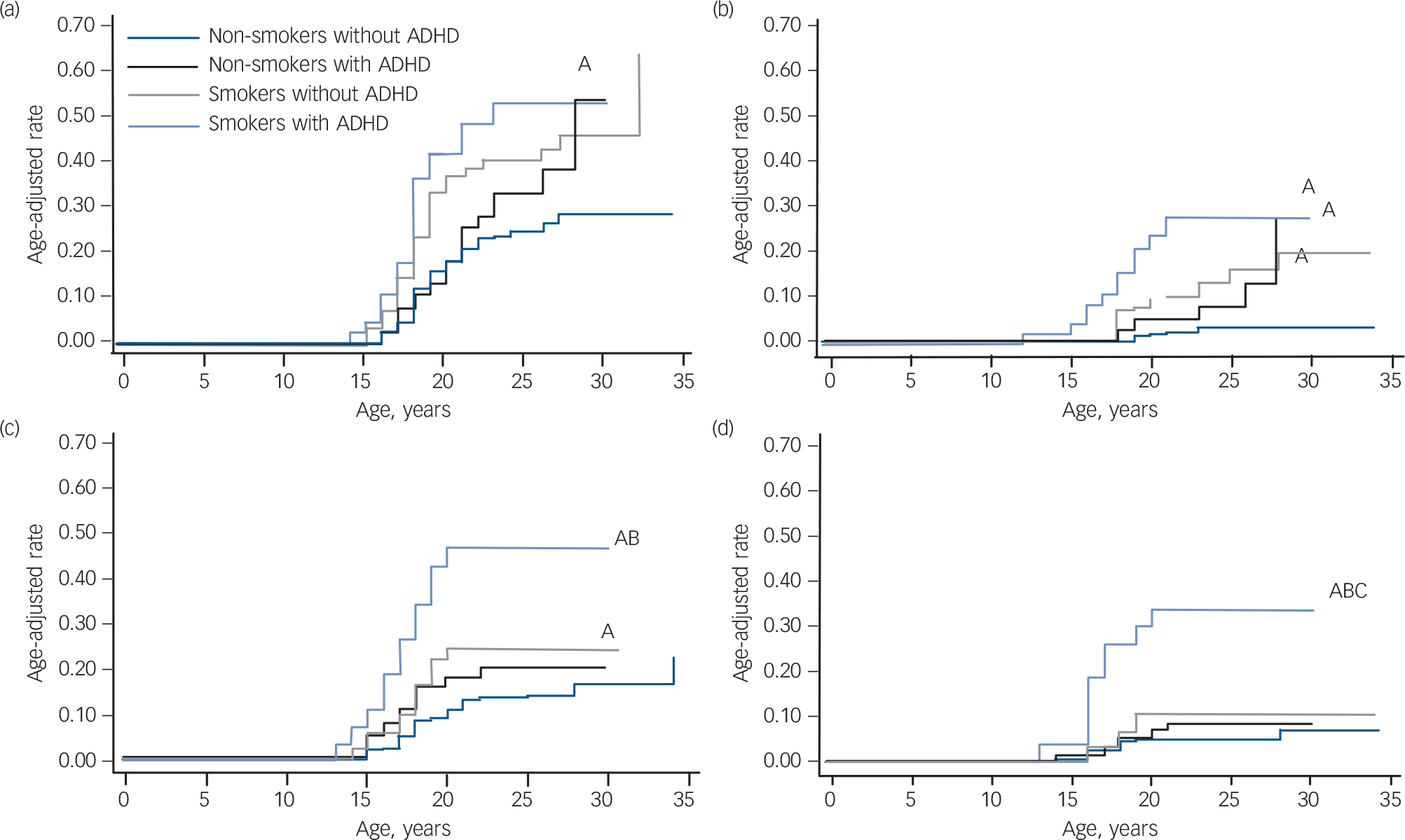 Cigarette smoking was defined as ever having smoked more than three times a week or any regular habit of smoking (e.g. only at parties) for an age at onset before age 18 years. For onset at age 18 years or after, cigarette smoking was defined as smoking every day. For the primary analysis, participants were included if they were reassessed at the 10- or 11-year follow-up. Participants were excluded if they reported an age at onset of any psychoactive substance use disorder at the same age or prior to the age at onset of smoking (n = 122; 47 with ADHD, 75 without ADHD). This yielded a total of 651 participants. Participants were grouped into four groups according to their ADHD diagnosis at baseline and their lifetime smoking status. We compared the resulting four groups on demographic features. We tested the risk of developing psychoactive substance use disorders using Cox proportional hazard models. The reported age at onset was used as the failure time for each substance use disorder.