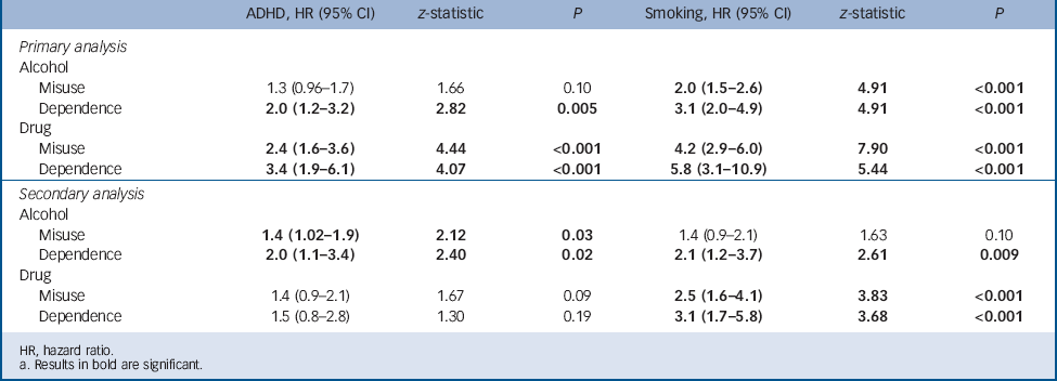 | ADHD, HR (95% CI) | z-statistic | P | Smoking, HR (95% CI) | z-statistic | P | |