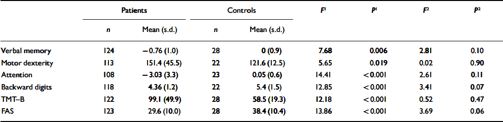 Differences in cognitive performance between patients and controls remained when gender, education and premorbid IQ were included as covariates. After inclusion of the speed of processing as an additional covariate, none of the differences reached the established significance. Table 2 shows the results of ANCOVA before and after controlling for speed of processing.