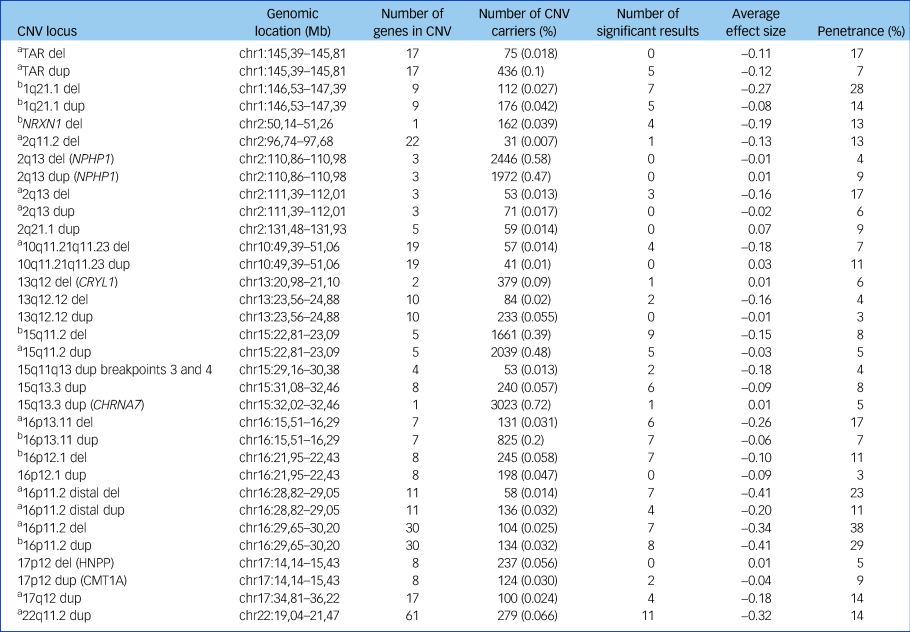 The number of significant results is shown, using a threshold of false discovery rate of 0.05. The average effect size is the mean of the seven cognitive tests coefficients for that CNV from regression analyses (a lower number indicates worse impairment). Penetrance data are based on Kirov et al,Reference Kirov, Rees, Walters, Escott-Price, Georgieva and Richards16 with control frequencies updated by UK Biobank data and indicate the cumulative risk of CNV carriers to develop schizophrenia, autism spectrum disorder or intellectual disability. CNV, copy number variant; del, deletion; chr, chromosome; dup, duplication; HNPP, hereditary neuropathy with liability to pressure palsies.
