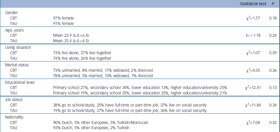 Table 1 Demographic characteristics of participants receiving cognitive–behavioural therapy (n=40) and treatment as usual (n=42)