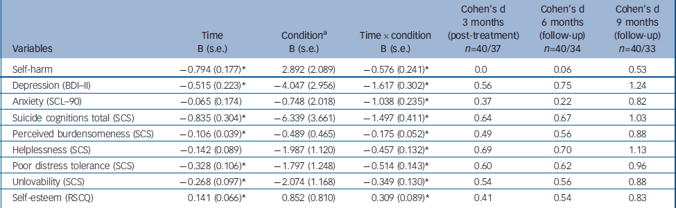 | Variables | Time B (s.e.) | Conditiona B (s.e.) | Time × condition B (s.e.) | Cohen's d 3 months (post-treatment) n=40/37 | Cohen's d 6 months (follow-up) n=40/34 | Cohen's d 9 months (follow-up) n=40/33 |