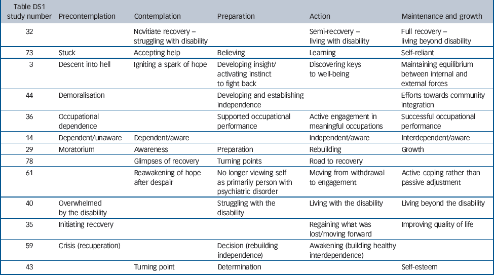 Fifteen studies developed recovery stage models. The studies were organised using the transtheoretical model of change, Reference Prochaska and DiClemente15 as shown in Table 3.