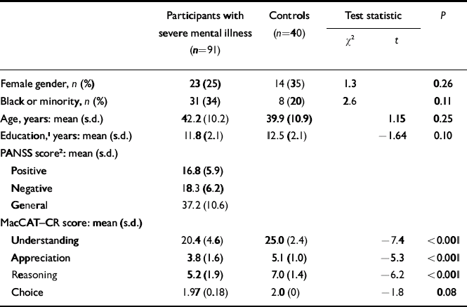| Participants with severe mental illness (n=91) | Controls (n=40) | Test statistic | P | |||