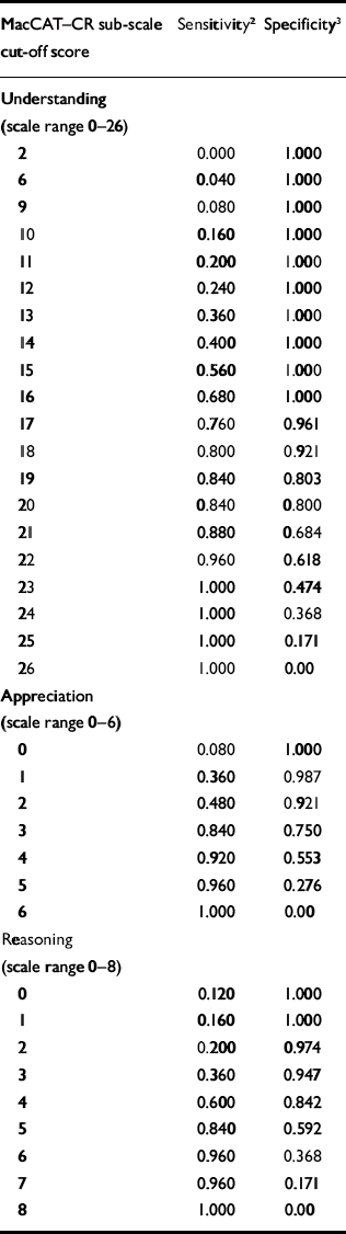 | MacCAT–CR sub-scale cut-off score | Sensitivity 2 | Specificity 3 |