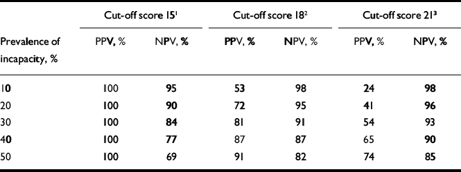 A high PPV implies a low false-positive rate (i.e. low likelihood of mistakenly excluding a capable person); a high NPV implies a low false-negative rate (i.e. low likelihood of mistakenly enrolling an incapable person). In determining what degree of decisional capacity to require of research participants, it would be undesirable to use a high cut-off score when prevalence is low (e.g. understanding score of 21 at 10% prevalence of incapacity) because 76% of persons excluded as too impaired will in fact be capable (given the PPV of 24%). Such a practice would not only be inefficient but also would unfairly exclude willing and capable persons from participating in research. It would also be ethically undesirable to use a low cut-off when the prevalence of incapacity is high (e.g. at 50% incapacity, almost a third of those who test capable will in fact be incapable given the NPV of 69%).