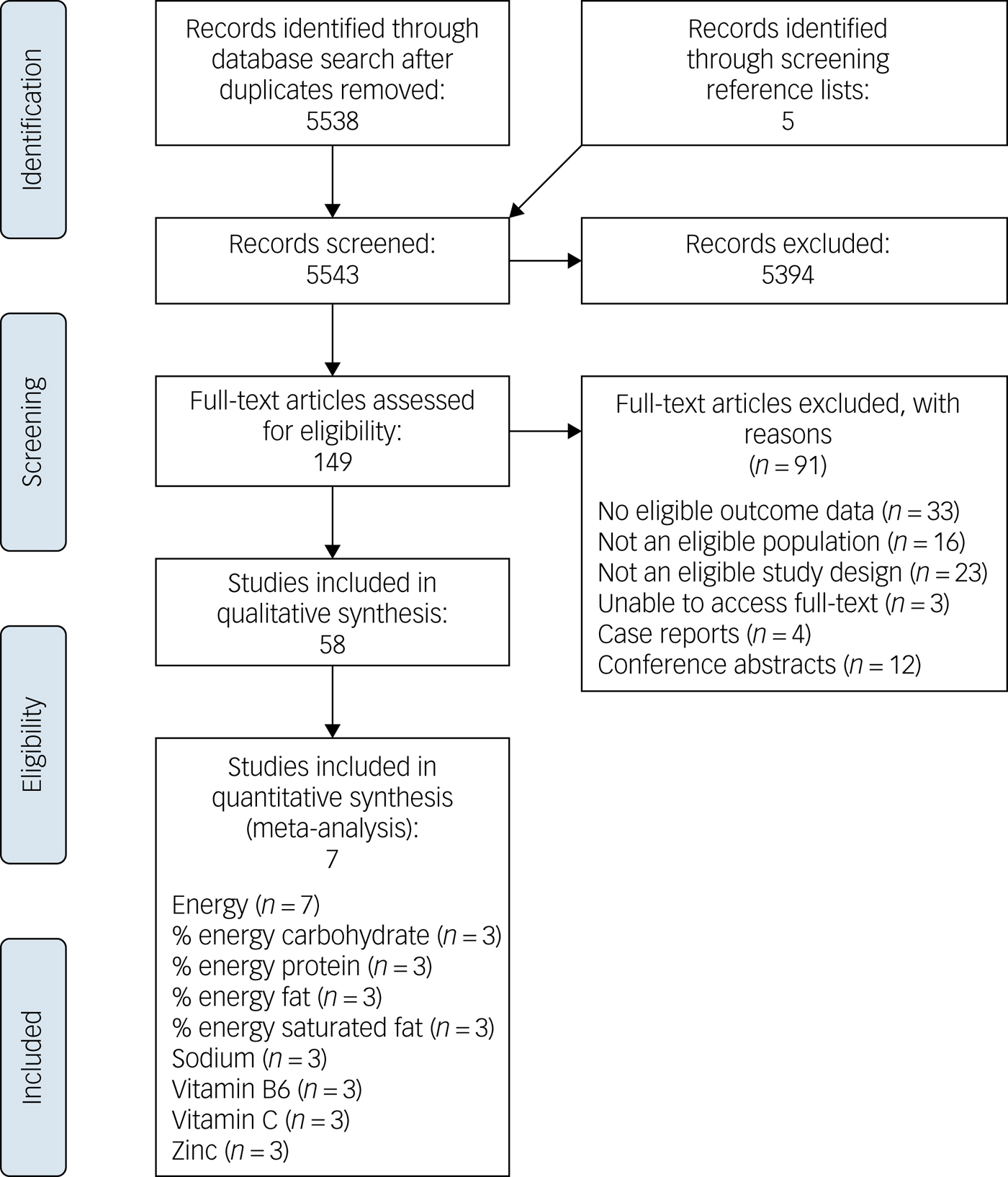Electronic database searches identified 5538 unique titles after accounting for duplicates, as summarised in Fig. 1. Five additional titles were sourced by screening a relevant references.Reference Dipasquale, Pariante, Dazzan, Aguglia, McGuire and Mondelli12 A review of titles and abstracts led to the exclusion of 5394 titles. Full-texts were assessed for the remaining 149 titles, of which 91 were excluded for reasons detailed in Fig. 1. In total, 58 studies were identified for critical appraisal and included in this review.Reference Adolfo, AhnAllen and Tidey19–Reference Noguchi, Hiraoka, Watanabe and Kagawa76