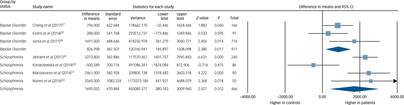 In two studies that only reported median averages,Reference Jacka, Pasco, Mykletun, Williams, Nicholson and Kotowicz46, Reference Konarzewska, Stefańska, Wendolowicz, Cwalina, Golonko and Malus50 medians were used as an imputed mean and standard deviations were estimated from the pooled standard deviations across all other studies. For the one study that did not report standard deviations for controls,Reference Nenke, Hahn, Thompson, Liu and Galletly54 standard deviations was imputed from a study of similar sample size.Reference Haruyuki, Kumagai, Kimura, Kolke and Shimizu42