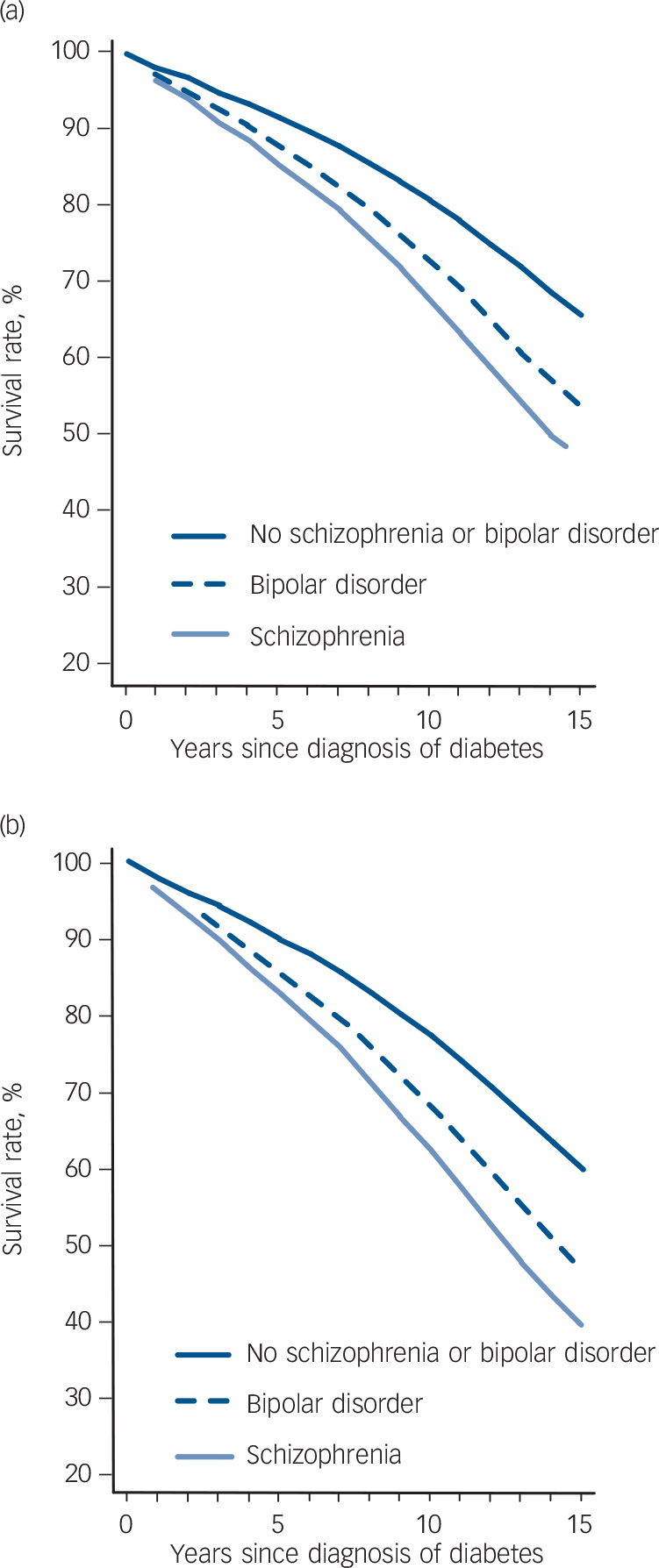 A study in the USA examined the impact of diabetes on mortality in 197 individuals with co-occurring psychotic and substance use disorders participating in a randomised controlled study of integrated mental health and substance misuse treatment. The study found that participants with evidence of diabetes were significantly more likely to die during follow-up than participants without evidence of diabetes. Reference Jackson, Covell, Drake and Essock7 However, no study has yet demonstrated this in a naturalistic population sample. This study examines mortality rates in a cohort of people with diabetes, comparing those with and without schizophrenia and bipolar disorder. It tests the hypothesis that having one of these mental illnesses increases the risk of premature death in individuals with diabetes in a large and representative primary care population sample.