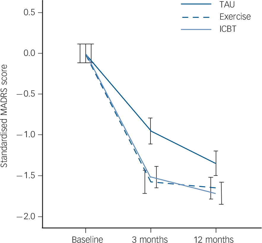 Fig. 2 Reduction in depression severity categorised by treatment group. ICBT, internet-based cognitive–behavioural therapy; MADRS, Montgomery–Åsberg Depression Rating Scale; TAU, treatment as usual.