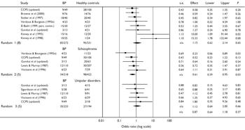 Given the variability in sample sizes and in quality and quantity of the available data, we calculated random effects estimates for each association. A Mantel-Haenszel random effects model leads to wider 95% confidence intervals than a fixed model as it assumes a different underlying effect for each study. A homogeneity statistic (Q) was calculated for each pooled analysis. Funnel plots of study-specific estimates against sample size suggested some gaps in the region of large-scale negative studies (bipolar disorder v. healthy controls) or positive studies (bipolar disorder v. unipolar disorders).