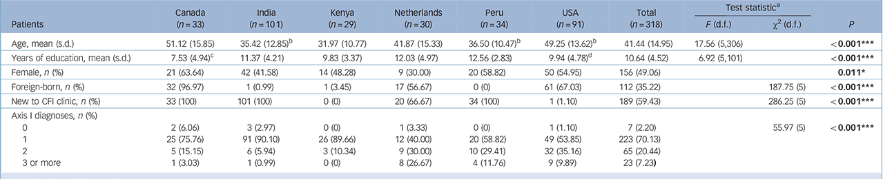 The field trial enrolled 321 patients; 3 were under 16 and were excluded, leaving 318 for analysis, of whom 189 were new and 129 existing patients. They had a mean age of 41.4 and 10.6 years of education; half were female (Table 1 and Table DS6). Most countries had an even distribution of employed, unemployed and participants who were out-of-the-labour-force (for example retired), except for the USA where nearly half were disabled. Marital status differed by country. Proportion of foreign-born individuals ranged widely, from 0% in Peru to 97% in Canada. Patients' primary language varied by site. Significant cross-national differences were observed for all sociodemographic variables (gender: P<0.05; all others: P<0.001). Clinically, 70% of patients received one DSM-IV Axis I diagnosis, 20% received two, 7% three or more, and 2% none (Table 1); this proportion varied significantly across countries (P<0.001). Depressive disorders were diagnosed most frequently, followed by anxiety disorders.