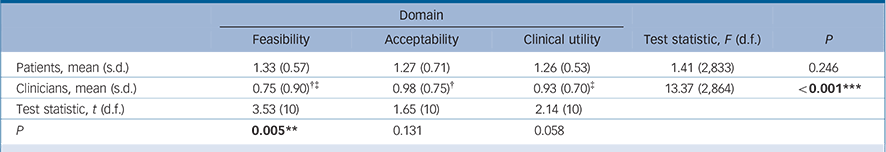 Patient and clinician ratings of feasibility, acceptability and clinical utility were positive, but varied significantly cross-nationally (online Table DS7). Once adjusted for site effects, mean overall results for all three outcomes (Table 3) were positive among patients – scoring 1.26–1.33 on a scale from −2 to +2 – but evaluations were less positive among clinicians, with scores of 0.93–0.98 on utility and acceptability and 0.75 on feasibility. Overall, feasibility was significantly lower than the other indices among clinicians, and significantly lower than patients' feasibility rating. Clinicians also rated acceptability and utility lower than patients, but not significantly. By contrast, patient scores across assessment domains were nearly identical.