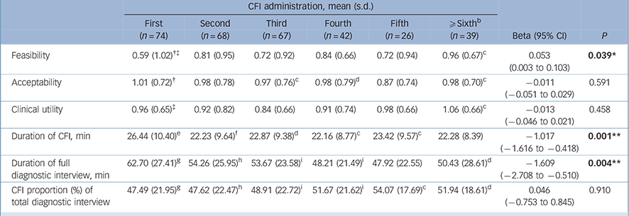 Duration of the full diagnostic interview also decreased significantly albeit more gradually. By the last administration, the duration of the full intake assessment, including 22 min for the CFI, was 50 minutes. This is comparable to the time required for an initial assessment in many mental health settings. In the USA, for example, average duration of community-based psychiatric visits (initial and follow-up combined) was 32–38 min in 1989–2006; Reference Mechanic, McAlpine and Rosenthal38–Reference Olfson, Marcus and Pincus40 intakes are often 45–50 min. Our study found substantial international variation in intake duration. Some of this variation may derive not only from resource constraints – few clinicians for many patients – but also from clinic characteristics. The sites with the longest intakes (Canada and The Netherlands) included specialised programmes for immigrants and refugees, whereas most other sites operated in general community clinics. Sites also differed significantly in the proportion of total interview time devoted to the CFI, yet all were able to integrate the CFI into routine intake procedures. The proportion of the interview devoted to the CFI increased slightly with experience, suggesting clinicians continued to find it useful and that the information it yielded was relevant to other aspects of the diagnostic interview, inasmuch as less time was required for the overall interview as a practice effect.
