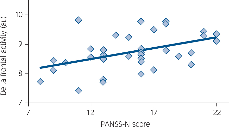 Fig. 2 Association between right-frontal delta and negative symptoms (on the Positive and Negative Syndrome Scale – negative scale score (PANSS-N)) in schizophrenia (R 2 = 0.19, P = 0.01). au, arbitrary units.