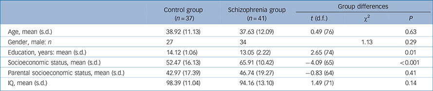 A total of 41 patients with chronic schizophrenia (34 men, mean age 37.63 years (s.d. = 12.09)) and 37 age-matched controls (27 men; mean age 38.92 years (s.d. = 11.13)) were recruited. Recruitment procedures and inclusion and exclusion criteria for schizophrenia were: (a) diagnosis of schizophrenia with no other Axis I diagnosis, determined by Structured Clinical Interview for DSM-IV Axis I disorders (SCID-I); Reference First, Spitzer, Gibbon and William37 (b) stable, continuous treatment with antipsychotic medication for at least 3 months; (c) no history of substance dependence in the past 3 years; (d) no history of alcohol or other substance misuse in the past 3 months; (e) no history of head injury with loss of consciousness for more than 5 min; and (f) no psychiatric hospital admissions in the past 3 months. Selection criteria for the control group were: (a) no history of Axis I psychiatric dysfunction; (b) no history of substance dependence in the past 3 years; (c) no history of alcohol or other substance misuse in the past 3 months; (d) no family history of a psychotic disorder in first-degree relatives by self-report; and (e) no history of head injury with loss of consciousness for more than 5 min or other neurological disease. As shown in Table 1, groups did not differ in age, parental socioeconomic status (SES, based on education and occupation information Reference Oakes and Rossi38 ) or general cognition (IQ estimate from Shipley Institute of Living Scale Reference Zachary39 ). The schizophrenia groups' SES and education were significantly lower than the controls groups' (SES missing for five participants in the control group and six in the schizophrenia group, and data on parental SES missing for six in the control group and six in the schizophrenia group). Two people in the schizophrenia group and four in the control group were left-handed as assessed by the Waterloo Handedness Questionnaire. Reference Bryden40 Twelve participants in the schizophrenia group and eight in the control group were smokers. Before the study, the nature of the study was explained to all participants and written consent was obtained. The study was approved by the Human Subjects Institutional Review Boards at the Raymond G. Murphy Veterans Affairs Medical Center (VAMC) and the Human Research Review Committee (HRRC) at the University of New Mexico School of Medicine.