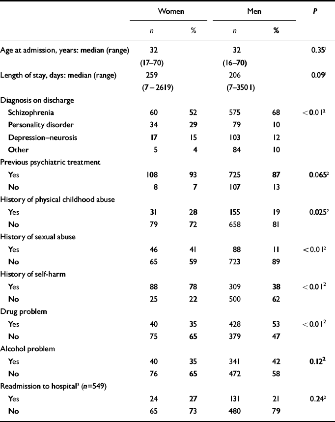 Table 1 shows gender differences in admission characteristics and other clinical variables. Women had higher historical levels of self-reported physical and sexual abuse and much higher levels of self-harm than men. Women, however, were less likely than men to have a drug problem and possibly less likely to have problems with alcohol, although the latter did not reach statistical significance. Women were more likely than men to be admitted with a personality disorder and were more likely to have had previous psychiatric treatment. No difference was found between men and women in terms of re-admission to any psychiatric hospital over follow-up.