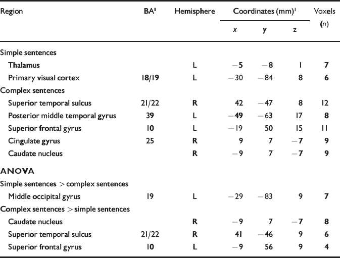 Table 1 Main foci of signal changes in the control group during production of continuous speech: correlations with simple and complex sentences are shown (P<0.001), followed by statistical differences between the two conditions (P<0.05)