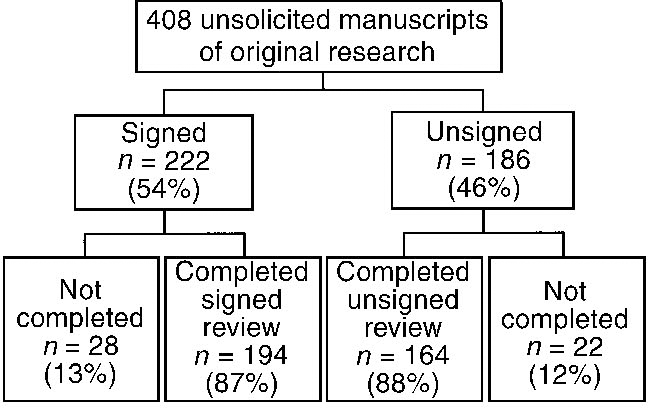 This study has many strengths. They include the large sample size, the randomised controlled design, the availability of a validated quality instrument, the use of blind ratings, and good interrater reliability as measured by weighted κ statistics. The study does, however, have several limitations. No reminders were sent to referees who failed to respond to the postal questionnaire. As referees give their valuable time free of charge, it was felt to be inappropriate to bother them with reminders. It is therefore possible that we could have gained a higher response rate. Those who refused to participate were not asked to provide a reason for their refusal. This number may have been too small to allow us to draw any meaningful conclusions. Identification of the reasons for 13% of reviews in the signed group not being returned would have been useful. Although these reviewers agreed to sign their names at the outset of the trial, when actually faced with doing so they may have decided against it. However, the fact that a similar percentage (12%) of reviews was not returned in the unsigned group suggests that this may be the normal rate of non-response for all reviews in general. Randomisation of reviews meant that individual reviewers could be allocated to either group on different occasions. It could therefore be argued that the samples were not entirely independent. However, the use of a paired analysis was inappropriate, as 58 reviewers completed only one review.