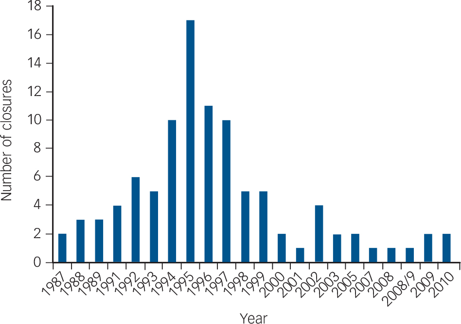 Bed numbers in large psychiatric hospitals peaked in the early 1950s. In 1962 the Hospital Plan for England and Wales predicted the closure of half of these beds by 1975. The decision to close the hospitals and move to a range of community-based services was set out in 1975 in the Better Services for the Mentally Ill white paper. 1 The estimated timescale of 25 years was remarkably prescient, most of the 100 or so had closed by 2000 (the peak year of 1995 saw 17 close) with the remainder shut by 2010 (Fig.1). 2 The closure of the hospitals, and the development of community services had multi-party political support. In retrospect, the scale and pace of change was remarkable.