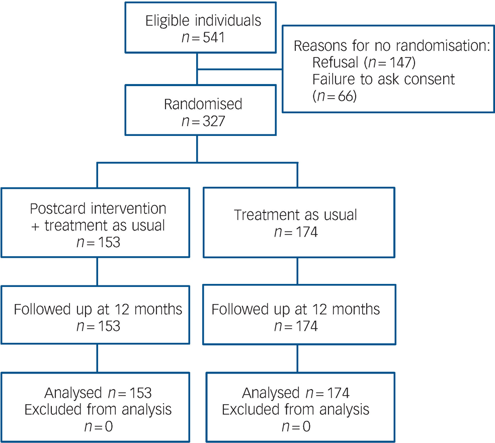 Participants were randomised 1:1 by research staff into two groups (treatment as usual; treatment as usual plus the postcard intervention) using predetermined computer-generated random numbers. The psychiatric emergency service clinicians were masked to treatment allocation. Treatment as usual consisted of crisis assessment and referral to in-patient community-based mental health services. The intervention consisted of a series of six ‘postcards’ sent by mail during the 12 months following the participant's index presentation for suicide attempt or self-harm. The text and format of the postcard were based on those used by Carter and colleagues. Reference Carter, Clover, Whyte, Dawson and D'Este14,Reference Carter, Clover, Whyte, Dawson and D'Este15 The postcard read: ‘It has been a short time since you were here at PES (Psych Emergency), and we hope things are going well for you. If you wish to drop us a note we would be happy to hear from you'. (We used six rather than the eight postcards Carter used for several reasons: no strong justification has been presented for eight postcards; we were seeking to establish the minimum number of postcards that would be effective so that the intervention could be translated to a real-world situation in which secretarial staff would send the postcards routinely, and, based on consultation with Carter, who suggested earlier postcards might be the effective element, we decreased the number of later, and thereby, overall, postcards).