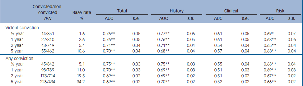 Table 2 Number of people who received a conviction and the number who did not, base rates of convictions following discharge, and area under the curve for the HCR—20 as a function of follow-up period