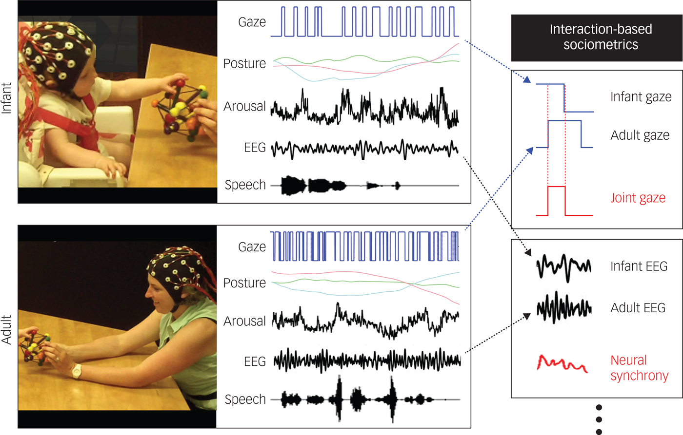 Imagine walking into a child developmental clinic of the future. Your infant is brought into a play room where electroencephalogram (EEG) electrodes are placed on her scalp to measure brain activity, and electrocardiogram electrodes on her chest measure heart rate and arousal. These electrodes wirelessly transmit her neural and physiological signals to the monitoring station next door. A microphone is buttoned onto her vest and motion capture cameras track her movements and posture. Each toy is equipped with eye-tracking software that dynamically monitors your child's gaze patterns as she switches her attention from one toy to the next. Next, a psychologist, who is similarly equipped with measurement devices, walks into the room and manoeuvres the social interaction through different phases, each designed to elicit a different social response. High-performance computers then analyse the complex data-set, using powerful machine learning algorithms. But rather than focusing on your child's individual data, these algorithms extract sociometrics that quantify how your child relates to the psychologist, as illustrated in Fig. 1. Some sociometric indices lie within the typical range for children her age, but other indices may be less typical – such as the way she tends to avert her gaze from direct eye contact and has a sluggish neural synchronisation with (and faster decoupling from) the psychologist's brain activity patterns.