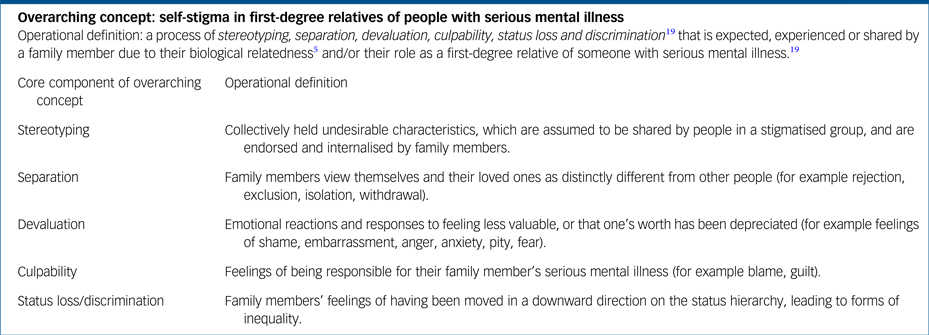 Mental illnesses are highly stigmatised conditions. For those with mental illnesses such as schizophrenia, symptoms have a dramatic impact on language, thought, affect, perception and sense of self. 1 Even so, for some, the burden of stigma actually outweighs that of the illness.Reference Hinshaw and Stier 2 Not only do individuals with mental illness experience stigma, but their family members report feeling stigmatised too.Reference Angermeyer, Schulze and Dietrich 3 – Reference Phelan 5 Stigma is a complex, multifaceted process that operates at several levels, including: institutions and structures,Reference Corrigan 6 society (or the public)Reference Corrigan, Kerr and Knudsen 7 and at the level of the individual. Self-stigma, also known as internalised stigma, operates at the level of the individual, and can be conceptualised as ‘a process whereby affected individuals endorse stereotypes […], anticipate social rejection, consider stereotypes to be self-relevant, and believe they are devalued members of society’.Reference Livingston and Boyd 8 Self-stigma has been conceptualised as a counterpoint to constructs such as empowermentReference Shih 9 and self-efficacy.Reference Livingston and Boyd 8 Self-stigma grows from experiences and perceptions of discrimination,Reference Livingston and Boyd 8 and has been postulated to be central to the psychological harm caused by stigma.Reference Livingston and Boyd 8 , Reference Boyd Ritsher and Phelan 10 , Reference Corrigan and Watson 11 Studies show that stigma is experienced,Reference van der Sanden, Bos, Stutterheim, Pryor and Kok 12 perceivedReference van der Sanden, Bos, Stutterheim, Pryor and Kok 13 and internalised by family members of people with mental illness. This phenomenon has been dubbed ‘courtesy stigma’Reference Angermeyer, Schulze and Dietrich 3 or ‘stigma by association’. Research suggests that self-stigma is as damaging for relatives as it is for people with mental illness themselves,Reference Ostman and Kjellin 14 causing psychological distress, suicidal thoughtsReference Ostman and Kjellin 14 and decreased quality of life;Reference van der Sanden, Pryor, Stutterheim, Kok and Bos 15 however, it is postulated to be amenable to change.Reference Shih 9 In order to evaluate the effectiveness of any interventions designed to mitigate self-stigma among relatives of people with mental illness, robust instruments with which to measure it are required.