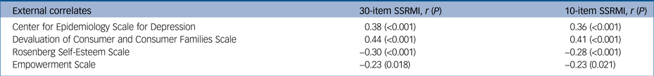 The selection of our external correlates was informed by the psychometric validation of the ISMI.Reference Ritsher, Otilingam and Grajales 16 We selected: the Centre for Epidemiological Studies Depression Scale (CES-D) to measure depressive symptoms,Reference Radloff 24 the DCCFReference Struening, Perlick, Link, Hellman, Herman and Sirey 21 to measure perceived stigma, the Rosenberg Self Esteem Scale (RSE)Reference Rosenberg 25 to measure self-esteem, and a subset of participants also completed a measure of empowerment (Empowerment Scale (ES)).Reference Rogers, Chamberlin, Ellison and Crean 26 We expected the CES-D and DCCF scores to have moderate positive correlations with SSRMI, and the RSE and ES to have moderate negative correlations with SSRMI. Correlations between the SSRMI and the CES-D, RSE, DCCF and ES were calculated.