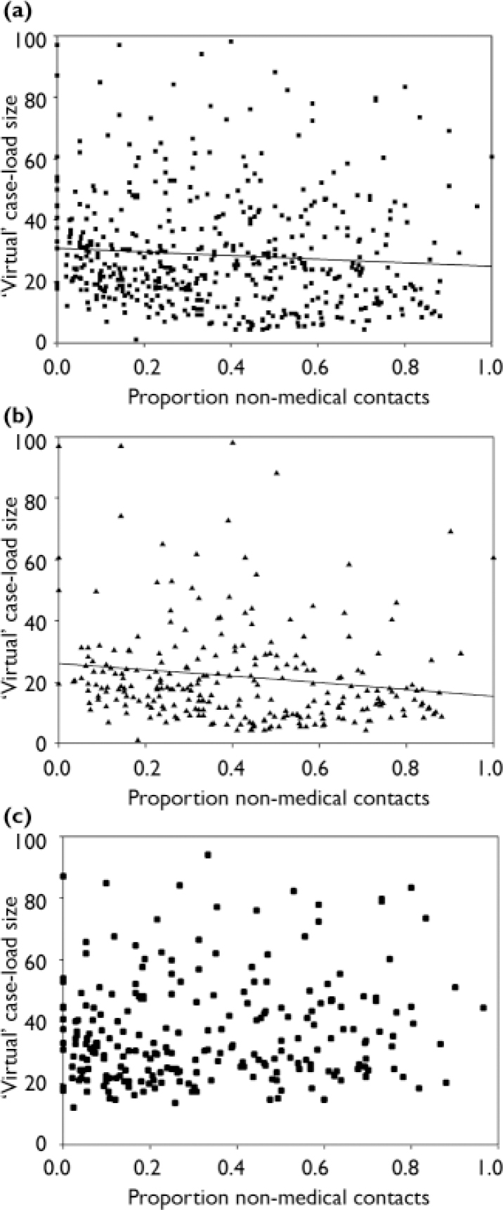 ‘Virtual’ case-load sizes were calculated for patients from their actual contacts over a 2-year period and were compared with the proportions of contacts devoted to medical and non-medical care (as a proxy for a more comprehensive service model).