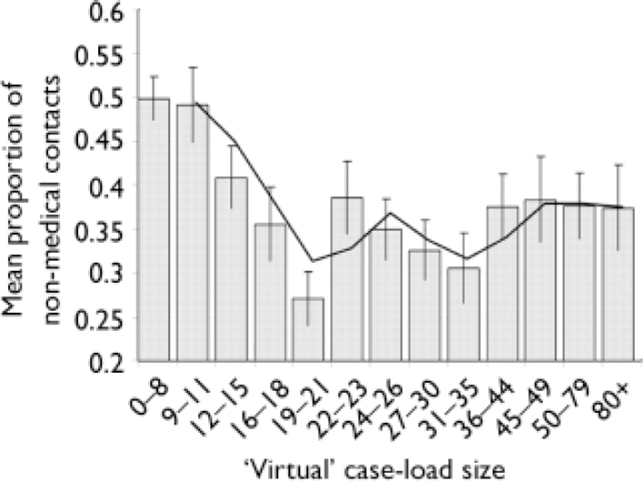 Figure 3 presents the mean proportion of non-medical contacts according to ‘virtual’ case-load size. The range of these steps is unequal as comparative numbers of results in each bin are required for analysis. Analysis by each individual case-load size (e.g. 10, 11, 12) was not possible because of empty cells. There was a steady increase in the proportion of non-medical contacts as case-load sizes fell from 1:19–21 to 1:9–11. The proportion of non-medical contacts was around 50% for case-load sizes below 9. The proportion of non-medical contacts varied in a rather irregular manner for case-load sizes between 1:22 and 1:34 and for sizes of 1:35 and above the proportion remained essentially stable.