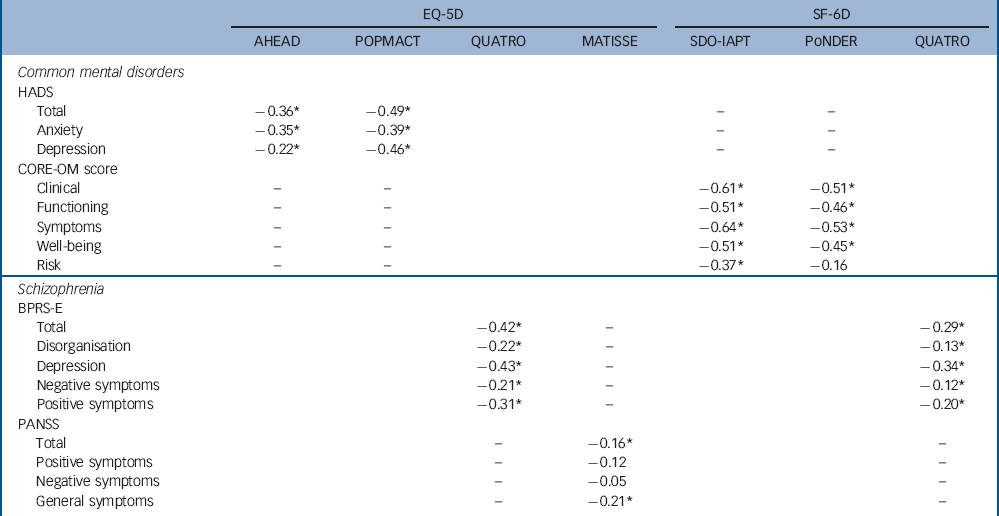 For schizophrenia, the validity of the EQ-5D and SF-6D in the QUATRO sample used BPRS-E cut-offs (31 for ‘mildly ill’, 41 for ‘moderately ill’, 53 for ‘markedly ill’ and 70 for ‘extremely ill’). Reference Leucht, Kane, Kissling, Hamann, Etschel and Engel36 For the MATISSE sample, PANSS cut-offs (58 for ‘mildly ill’, 75 for ‘moderately ill’, 95 for ‘markedly ill’ and 116 for ‘severely ill’) Reference Leucht, Kane, Kissling, Hamann, Etschel and Engel37 were used.