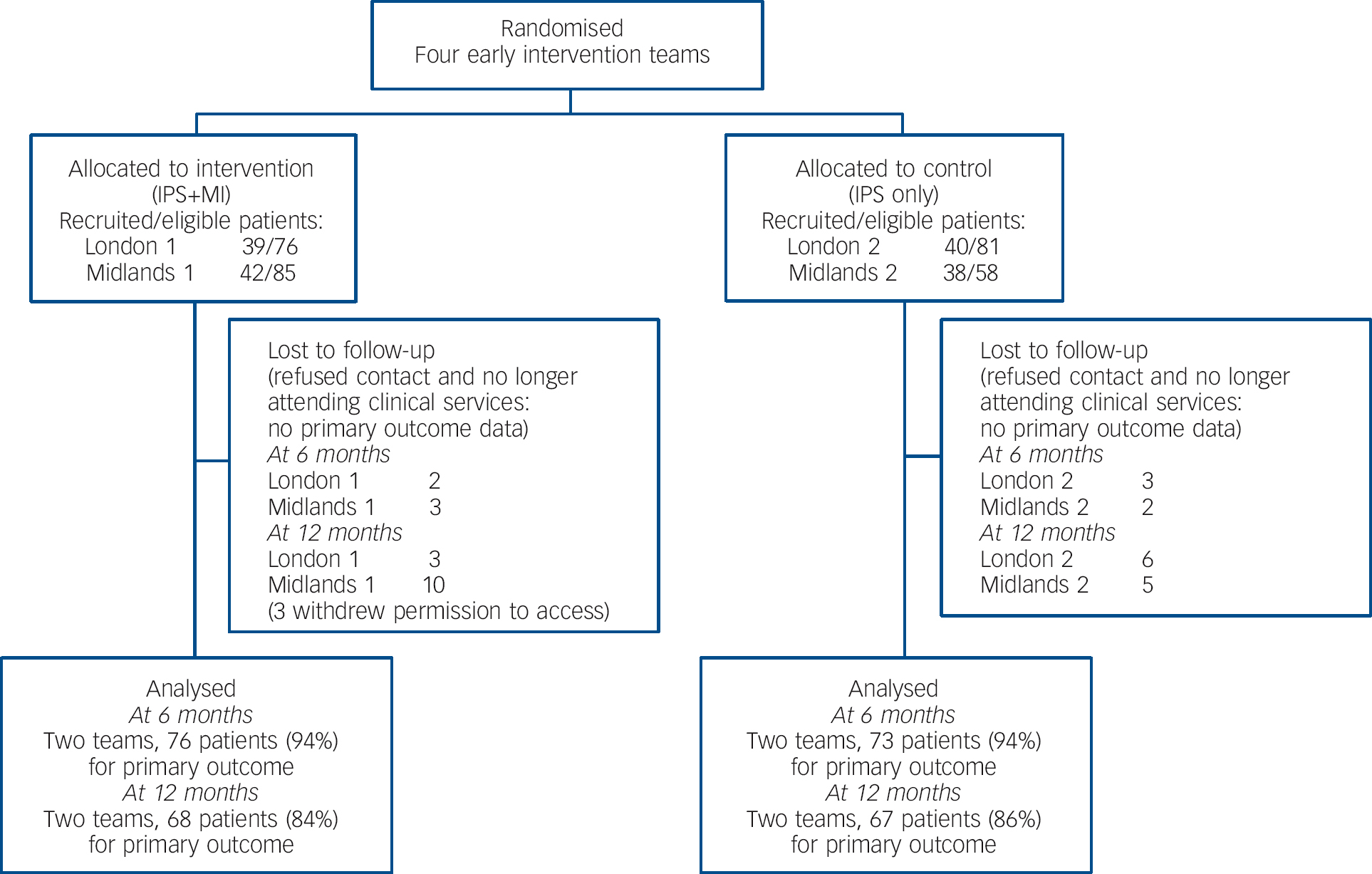 Unemployment is common in young people recovering from a first episode of psychosis,Reference Rinaldi, McNeil, Firn, Koletsi, Perkins and Singh1-Reference Marwaha and Johnson3 although many still aspire to return to paid employment.Reference Secker, Grove and Seebohm4-Reference Gioia and Brekke6 Of the various methods of vocational rehabilitation, the strongest evidence base is found for individual placement and support (IPS), which involves rapid job search combined with minimal pre-vocational preparation and ongoing support.Reference Crowther, Marshall, Bond and Huxley7,Reference Killackey, Jackson and McGorry8 However, the majority of studies have involved highly motivated participants, who signed up not only for employment but also to take part in research,Reference Drake, McHugo, Bebout, Becker, Harris and Bond9 and translation into routine clinical care has often proved difficult,Reference Bond, Becker, Drake, Rapp, Meisler and Lehman10 frequently because of the attitudes of key clinicians who discourage a return to work through a fear that the demands of employment might precipitate relapse.Reference Marwaha, Balachandra and Johnson11,Reference Rinaldi, Miller and Perkins12 We therefore aimed to determine the feasibility, acceptability and effectiveness of combining IPS with training staff in early intervention teams in ‘motivational interviewing’ strategies. These aim to address anxiety about employment ‘through a directive, client centred counselling style… helping clients to explore and resolve ambivalence’ (p. 326).Reference Rollnick and Miller13 There are over 150 controlled trials demonstrating the value of motivational interviewing in a variety of settings in health and social care,Reference Rollnick, Miller and Butler14 and these techniques are now beginning to be employed in mental health services, particularly to address motivational conflicts with regard to medication adherence.Reference Kemp, Hayward, Applewhaite, Everitt and David15,Reference Barrowclough, Haddock, Tarrier, Lewis, Moring and O'Brien16 Our primary hypothesis was that at 12 months a greater percentage of young people treated by early intervention teams that had staff trained in both IPS and motivational interviewing would achieve open employment compared with those in teams providing IPS only. A secondary hypothesis was that participants from the teams using motivational interviewing who found employment would have longer job tenure.